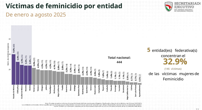Importantes han sido los esfuerzos del Estado Mexicano para erradicar la violencia contra de las mujeres, este flagelo representa un grave problema que atenta en contra de la dignidad y la vida de las mujeres, y de la sociedad en general. De acuerdo con información del Secretariado Ejecutivo del Sistema Nacional de Seguridad Pública en su Informe de violencia contra las mujeres de enero a agosto de 2025, lamentablemente 444 mujeres fueron víctimas de feminicidio.1