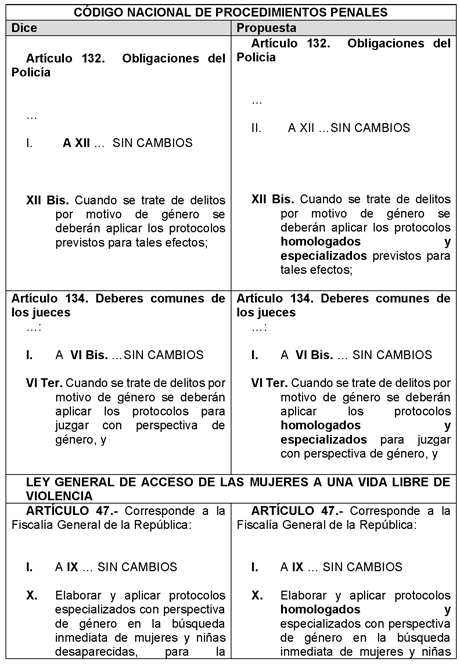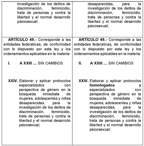 Efectivamente, nuestro marco jurídico mandata la implementación de protocolos en las legislaciones antes mencionadas, no obstante, esta propuesta propone añadir el mandato de su homologación, en una ley secundaria que tiene efectos generales para las leyes locales, lo que facilitará que las instancias correspondientes de procuración de justicia en los estados fortalezcan, armonicen, actualicen y apliquen los protocolos de actuación con la debida diligencia como herramientas fundamentales para el acceso de las mujeres a la justicia en nuestro país.