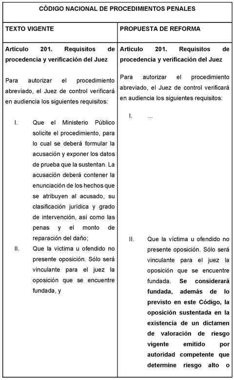 Decreto por el que se reforman los artículos 201 y 204 del Código Nacional de Procedimientos Penales, en materia de improcedencia del procedimiento abreviado cuando exista dictamen de valoración de riesgo vigente para la víctima