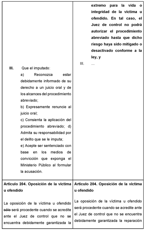 Actualmente, el artículo 204 del CNPP establece que la oposición fundada de la víctima u ofendido a la aplicación del procedimiento abreviado únicamente puede sustentarse en la falta de garantía de reparación del daño. Sin embargo, este marco normativo omite considerar la dimensión de seguridad personal, pese a que el propio sistema reconoce la existencia de riesgos reales, actuales o inminentes mediante dictámenes especializados de valoración de riesgo emitidos por autoridades competentes.