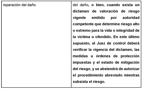 Por tanto, se estima necesario armonizar el contenido del artículo 204 del CNPP con los artículos 137 a 139 de este ordenamiento, a fin de que la procedencia del procedimiento abreviado quede condicionada a la inexistencia de un dictamen de riesgo vigente que clasifique la situación de la víctima en niveles alto o extremo.