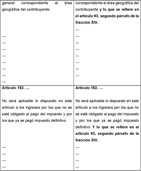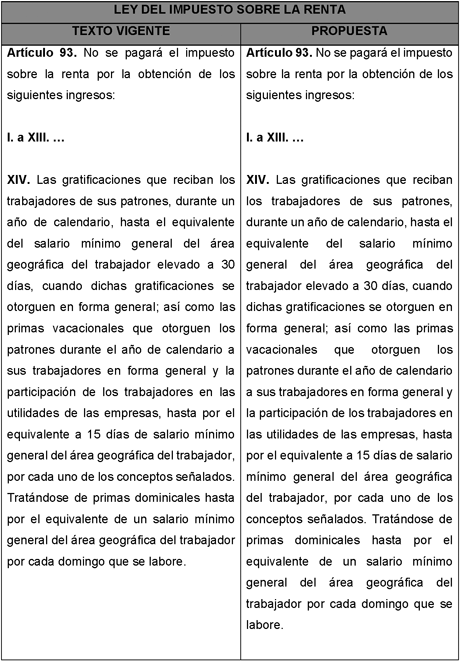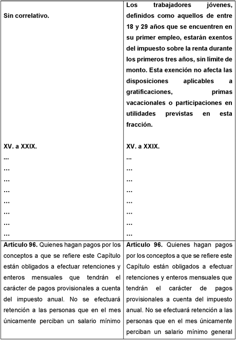 Para mayor claridad a la propuesta de la iniciativa que presento y que tiene por objeto adicionar un segundo párrafo a la fracción XIV del artículo 93; se reforma el artículo 96; y el artículo 152 de la Ley del Impuesto Sobre la Renta, en materia de exentar del pago del impuesto al salario que reciben las y los trabajadores jóvenes, me permito ilustrarla con el siguiente cuadro comparativo: