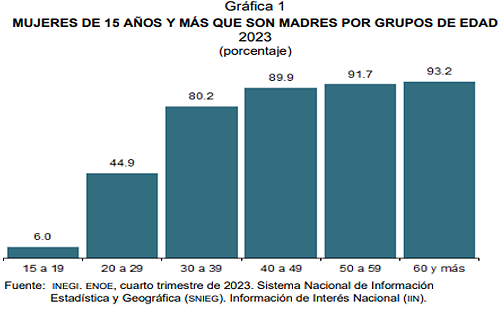 1. En la estadística a propósito del Día de la Madre 2024 que realiza el Instituto Nacional de Estadística y Geografía, INEGI, se expone: en “el cuarto trimestre de 2023, siete de cada 10 mujeres de 15 años y más (38 459 122) eran madres. Por grupos de edad, 6.0 por ciento de las adolescentes de 15 a 19 años y 44.9 por ciento de las jóvenes de 20 a 29 años, habían tenido una hija o hijo. Esta cifra se incrementa a nueve de cada 10 en las mujeres de 40 a 49 años.”
