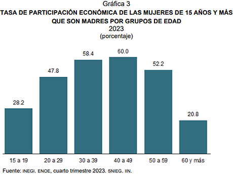 Referente a las mujeres que son madres y su participación en el mercado laboral, la estadística ofrece los siguientes datos: La tasa de participación económica2 de las madres de 15 años y más fue de 46.1 por ciento y, por grupos de edad, de 40 a 49 años fue de 60.0 por ciento. Siguieron el grupo de 30 a 39 años con 58.4 por ciento, y el de 50 a 59 años con 52.2 por ciento. Cabe destacar que 20.8 por ciento de las madres de 60 años y más, estaban ocupadas o buscaron trabajo (ver gráfica 3).