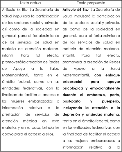 Artículo 64 Bis.- La Secretaría de Salud impulsará la participación de los sectores social y privado, así como de la sociedad en general, para el fortalecimiento de los servicios de salud en materia de atención materno-infantil. Para tal efecto, promoverá la creación de Redes de Apoyo a la Salud Materno infantil, con enfoque psicosocial para apoyar psicológica y emocionalmente durante el embarazo y el posparto, incluyendo la atención a la depresión y ansiedad materna , tanto en el ámbito federal, como en las entidades federativas, con la finalidad de facilitar el acceso a las mujeres embarazadas a información relativa a la prestación de servicios de atención médica en esta materia, y en su caso, brindarles apoyo para el acceso a ellos.