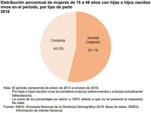 La ENADID 2018 estima que 90.3 por ciento del total de los embarazos (8.8millones) de mujeres de 15 a 49 años de edad en el periodo comprendido entre enero de 2013 y octubre de 2018, tuvieron una hija o hijo nacido vivo; es decir, fueron madres. De éstas, poco más de la mitad (53.1 por ciento) tuvo a su última hija o hijo por parto normal (vaginal).