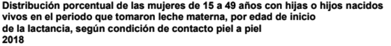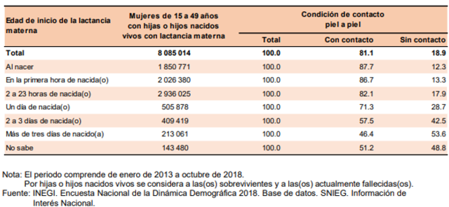 Los datos de ENADID 2018 reportan que de los 8 millones de madres que dan leche materna a sus hijos, 81.1% (6.5 millones) tuvo contacto piel a piel con su recién nacido. Se observa que el porcentaje de inicio de la lactancia materna en las primeras 24 horas de vida es mayor entre las mamás que tuvieron contacto piel a piel con su hija o hijo.