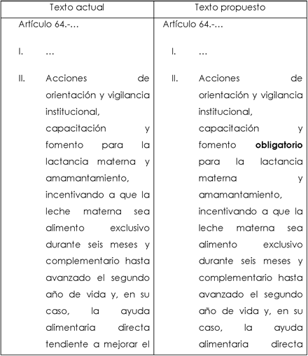 II. Acciones de orientación y vigilancia institucional, capacitación y fomento para la lactancia materna y amamantamiento, incentivando a que la leche materna sea alimento exclusivo durante seis meses y complementario hasta avanzado el segundo año de vida y, en su caso, la ayuda alimentaria directa tendiente a mejorar el estado nutricional del grupo materno infantil, además de impulsar, la instalación de lactarios en los centros de trabajo de los sectores público y privado;