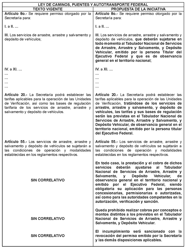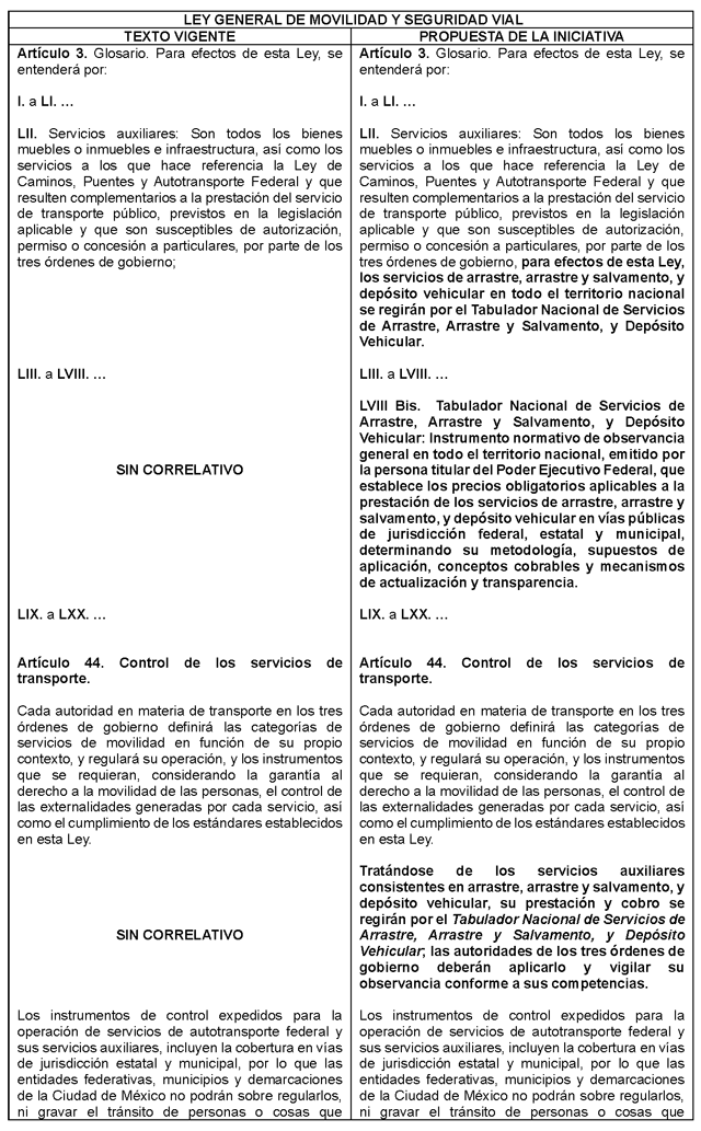 Por su parte, la Ley de Caminos, Puentes y Autotransporte Federal regula a su vez los servicios auxiliares y las atribuciones de la Secretaría competente en permisos, verificación y vigilancia, la propuesta reforma artículos clave para sujetar los servicios de grúas y depósito al tabulador nacional y cerrar las lagunas que hoy permiten tratamientos dispares.