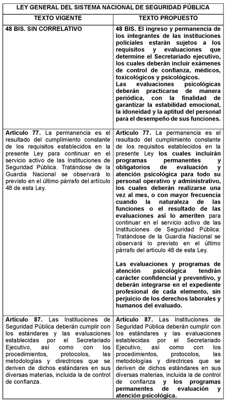 En consecuencia, esta iniciativa con proyecto de decreto pretende reformar los artículos 77, párrafo primero, 87, párrafo primero, adicionar el artículo 48 Bis y el párrafo segundo al artículo 77 de la Ley General del Sistema Nacional de Seguridad Pública, en materia de evaluaciones psicológicas periódicas a los elementos policiales de todos los niveles de gobierno, lo anterior con la intención de cuidar la salud mental de los elementos de la secretaria de seguridad pública de todos los niveles de gobierno, garantizando su mejor desempeño al ejercer sus funciones.
