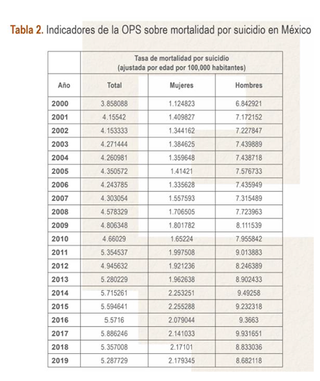 Además, la tasa de mortalidad es mayor en hombres, con una proporción cercana a 4:1 respecto a las mujeres (OPS, 2023), lo que evidencia un problema vinculado no solo con la salud mental, sino con estereotipos de género, falta de redes de apoyo y estigmatización.